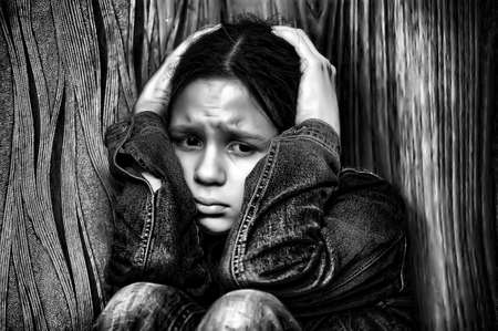 Child need help. Little girl crying. Black and white.