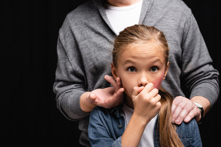 Abusive father hugging and touching scared child with bruise isolated on black