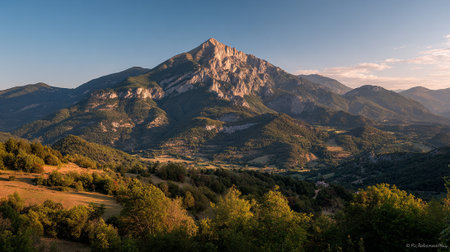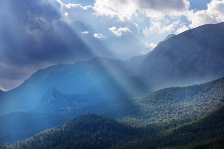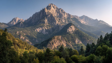 Scenic mountain landscape. Forested mountain valley during sunrise. Mountain peak with sunshine in the morning.