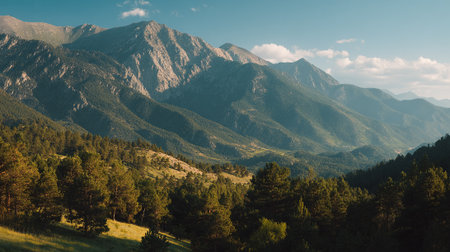 Mountain landscape with pine trees and blue sky with clouds at sunrise