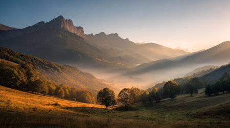 Mountain Valley Sunrise: Foggy Landscape with Rolling Hills and Dramatic Peaks