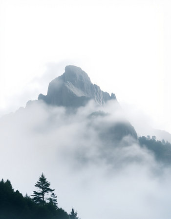 A stunning view of a mountain peak emerging from soft white clouds under a clear sky, depicting nature's serene beauty and the majesty of untouched landscapes.
