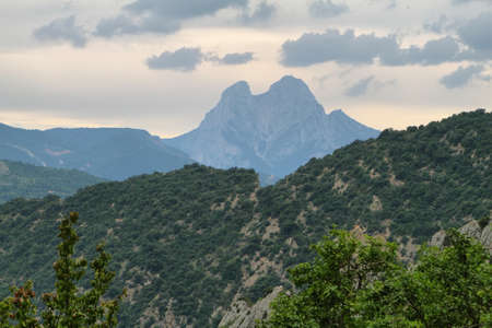 Landscape of mountains in Serra de Catllaras with majestic Pedraforca at background, Catalonia, Spain