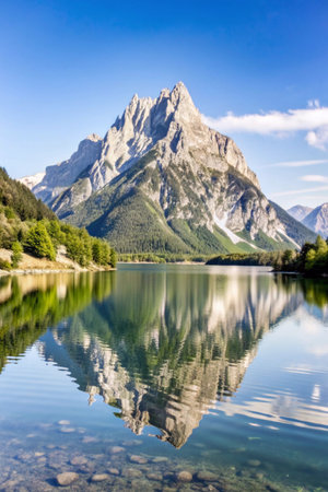 A breathtaking view of a majestic mountain range with lush trees in the foreground, set against a clear blue sky, A majestic mountain range under a clear blue sky