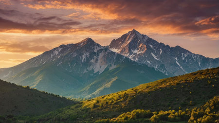 Scenic mountains with snow-capped peaks stand tall beneath a vibrant sunset sky creating a tranquil landscape perfect for travel and adventure themes.