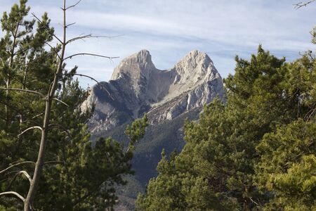 Landscape showing some trees in the foreground a snowy mountain called Pedraforca in Cadi mountain range in Catalonia