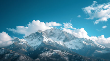 Majestic mountains capped with snow, under a clear blue sky with soft, white clouds