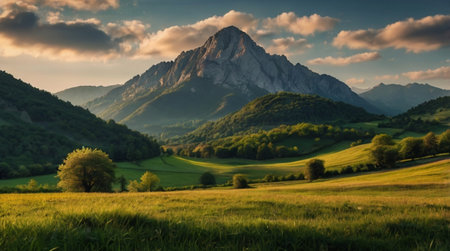 Majestic Mountain Peak Bathed in Golden Light at Sunset, a Beautiful Landscape.