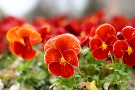Pansy plant in the garden, viola tricolor in the spring sunshine.