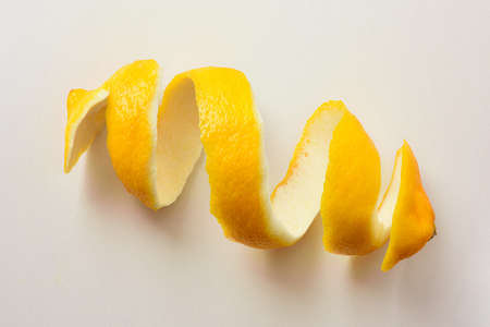 Curled strips of orange and lemon peels are scattered across a bright white surface.