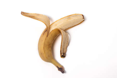 One ripe peeled banana on a white background. The banana pulp.