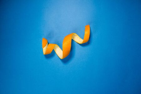 Close-up of spiral citrus fruit. Background with spiral mandarin peel on a wooden blue table. Artistic image with fruit. Texture