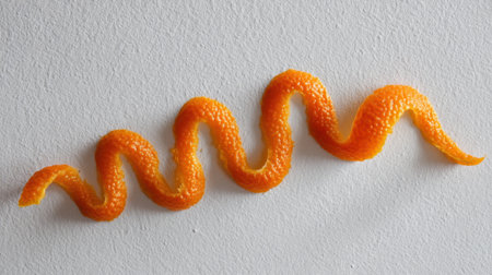 An artistic representation of vibrant orange citrus zest featuring a curled shape against a clean white background, perfect for culinary themes and fresh designs.