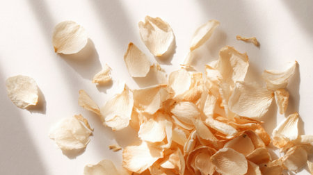 Delicate petals lie gracefully on a white surface catching the warm sunlight in a peaceful ambiance.