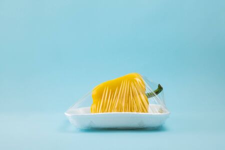 Recycling and environment concept: fresh food in plastic package. Yellow bell pepper wrapped in plastic clingfilm in blue background.