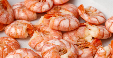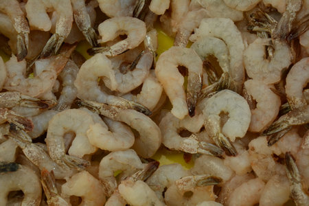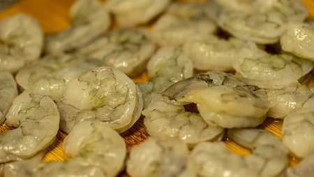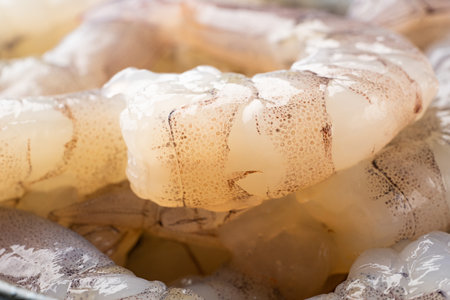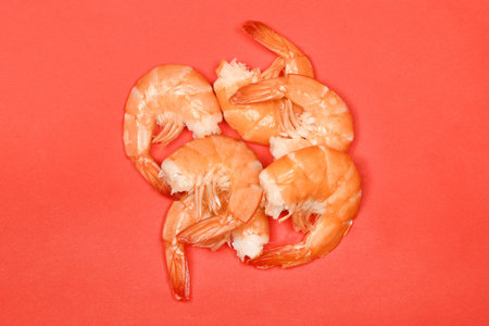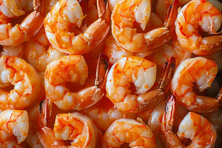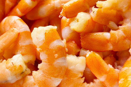 Close-up of fresh, peeled shrimp showcasing their vibrant orange and white colors. perfect for culinary presentations, seafood recipes, or food editorial content. highlights natural textures and inviting colors.