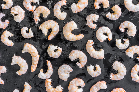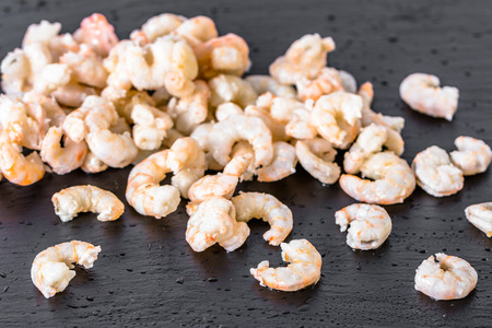 Boiled. Frozen shrimp on a black mica board. Close-up. Selected focus. High quality photo