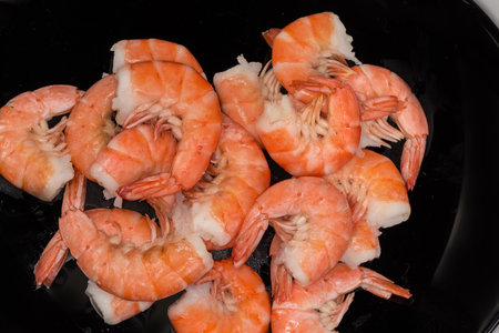 Freshly boiled unpeeled tails of the king prawns in their shells on the big black dish, top view close-up