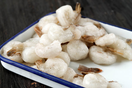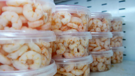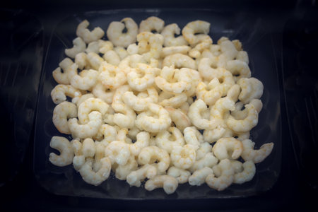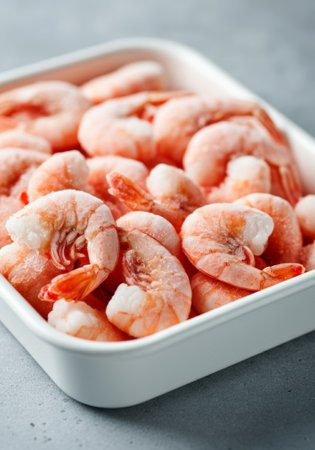 Frozen raw shrimp in white container on gray background - fresh seafood close-up.