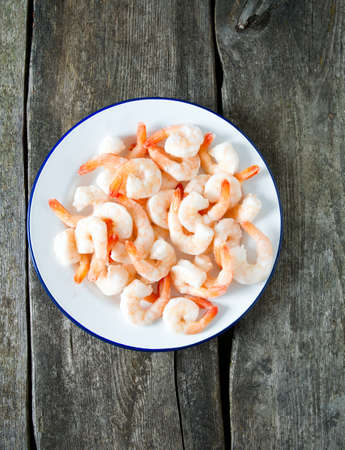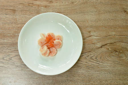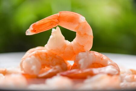 fresh shrimps served on plate / boiled peeled shrimp prawns cooked with green background in the seafood restaurant