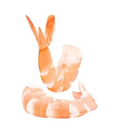 Shrimps cooked, prawns peeled, two pieces isolated on white background