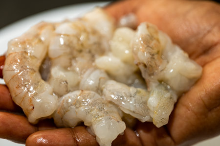 Hand holding fresh, raw, peeled, and deveined shrimp, ready for cooking. Perfect for seafood dishes.