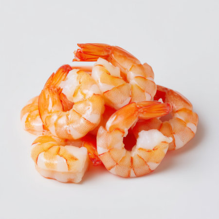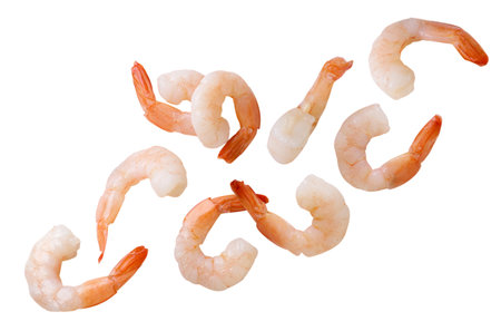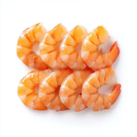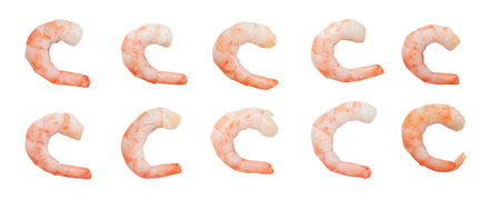 Freshly peeled shrimp arranged neatly on a pristine white background, perfect for showcasing the beauty of seafood in culinary photography projects.