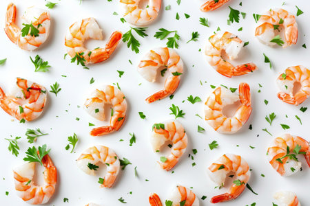 Freshly prepared shrimp garnished with parsley arranged elegantly on a white surface, invoking a sense of culinary artistry and vibrant flavors. Generative AI