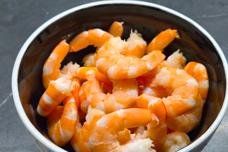 A bowl filled with perfectly cooked shrimp, showcasing their vibrant orange and white colors. ideal for use in various culinary applications such as salads, pastas, or as a standalone appetizer in gourmet dishes.