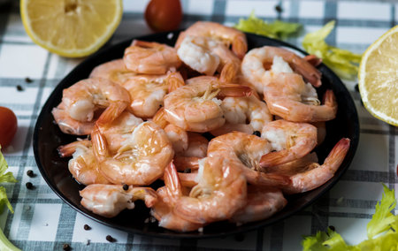 AI Generated. Freshly Cooked Shrimp With Lemon and Parsley on a Black Plate