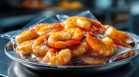 A stunning display of freshly cooked shrimp presented on a silver platter, showcasing vibrant colors and appealing packaging ideal for seafood lovers.