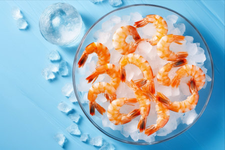 shrimps are laid on a bed of ice against a blue background. The mood is fresh and appetizing, ideal for themes of seafood, culinary preparation, and freshness. Copy space