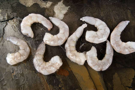 Shrimps lying in a row isolated on a dark background with copy space for text. Seafood buffet in restaurant concept. Use seafood buffet for promotions. emotional burnout, suspended animation metaphor