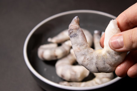 Close up of a hand holding a big frozen raw tiger prawn, blurred background with more shrimps in a grey bowl