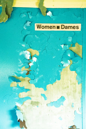 Blue and white poster with the words Women Dames written on it. The poster is on a wall and has a blue background