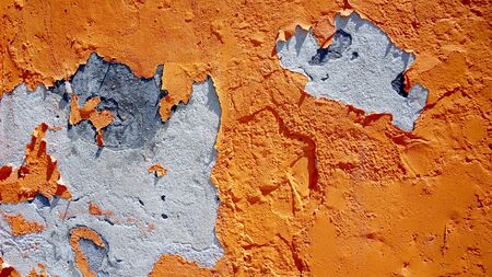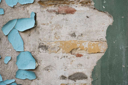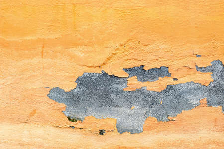 Peeling paint plaster with old weathered concrete obsolete wall cement worn texture messy background.