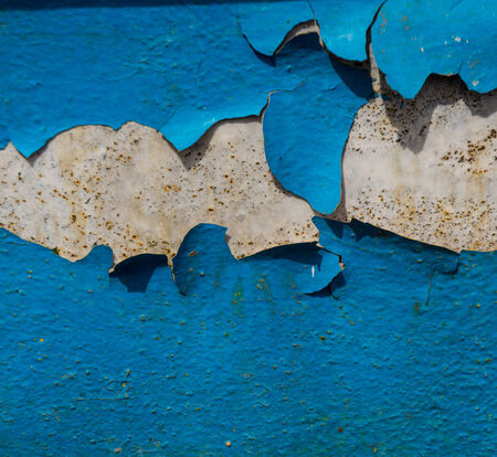 Old dirty painted wall. Several layers of peeling paint. blue green rusty. background texture. Horizontal orientation