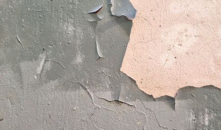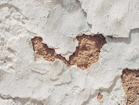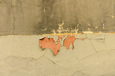 cracked peeling paint on old wall, closeup, background, aged and weathered surface of plaster, abstract dry grunge material, rough stucco texture, close-up from the dirty and grungy ancient house wall