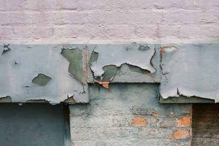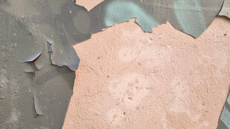 Close-up of damaged building wall paint. Cracked paint patches with peeling edges.