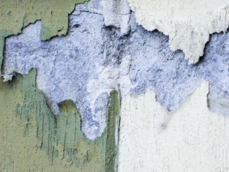 Close up of mold fungus and peeling and flaking paint due to rising damp and lack of maintenance on exterior wall