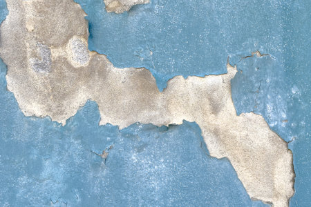Peeling blue paint on aged concrete wall. Abstract grunge background
