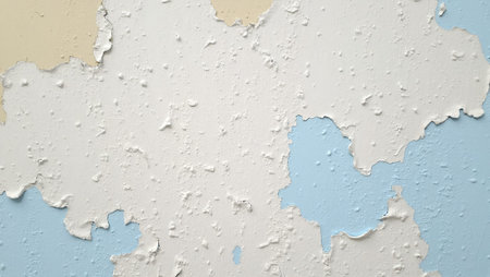 Peeling paint reveals texture and layers on an old plaster wall in a residential neighborhood showcasing age and wear.