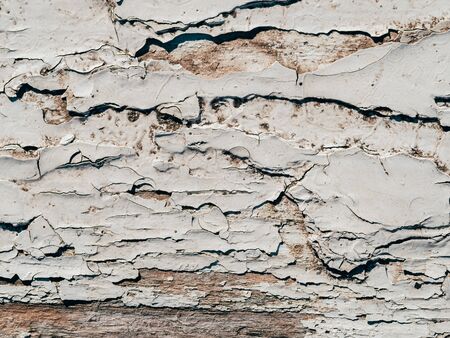 Abstract texture of cracked white paint surface with peeling layers.