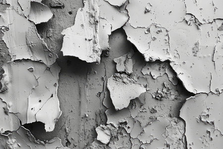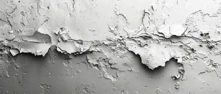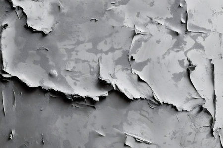 Close up of a rough concrete wall texture with peeling paint, creating an abstract pattern in shades of gray
