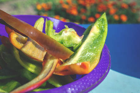 Chopped bell peppers in outdoors. Juicy pieces of sweet peppers. Vegetable salad ingredient, cooking healthy diet food