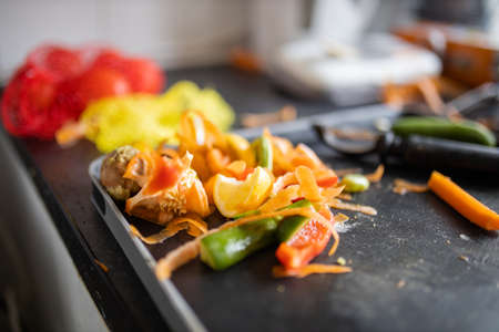 Organic peeled food, fruit and vegetables for recycling and to compost on a table. Zero waste, eco friendly, plastic free recycled, reusable, sustainable concept. Garbage sorting, kitchen leftovers