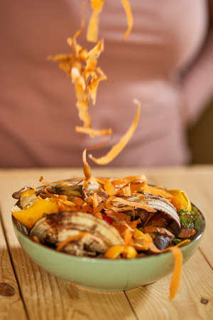 Women scraps peels carrots vegetable peeling, throws in compost bucket, organic composting