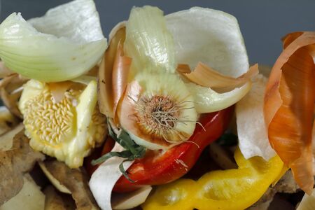Vegetable trimmings, onion skins, leftover food for composting. Zero Waste concept. Eco Friendly. Eco concept. Copy space for text.