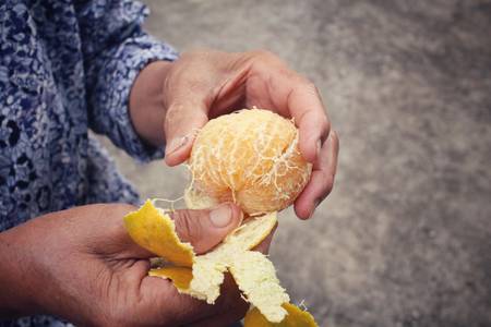 A person eating orange. woman is peels fresh juicy orange outside