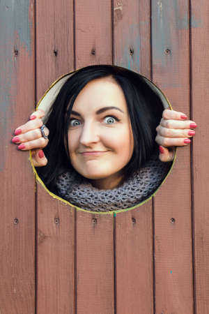 Woman with beautiful brown eyes with brown shadows and expressive eyebrows looks into the hole of shiny black paper